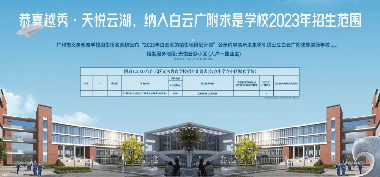 对于有孩子的家庭来说,教育配套绝对是买房的“第一考量因素”,毕竟谁也不想让孩子输在起跑线上,更不想每天花一两个小时接送孩子上学。而越秀天悦云湖的教育配套,堪称“王炸级别”,从小学到初中,全龄优质教育资源环绕,让家长省心又放心。项目最核心的教育优势,就是对口白云广附云湖实验学校——一所九年一贯制公办学校,已于2023年正式开学,这意味着业主子女可以直接就近入学,不用参与激烈的摇号,省去了很多麻烦。可能有朋友对这所学校不太了解,这里给大家详细介绍一下:白云广附云湖实验学校是广州大学附属中学与白云区合作创办的公办学校,依托广附的优质教育资源,师资力量十分雄厚,据学校官方数据显示,师资队伍中80%是985/211硕士学历,而且有不少老师来自广附本部,教学经验丰富。