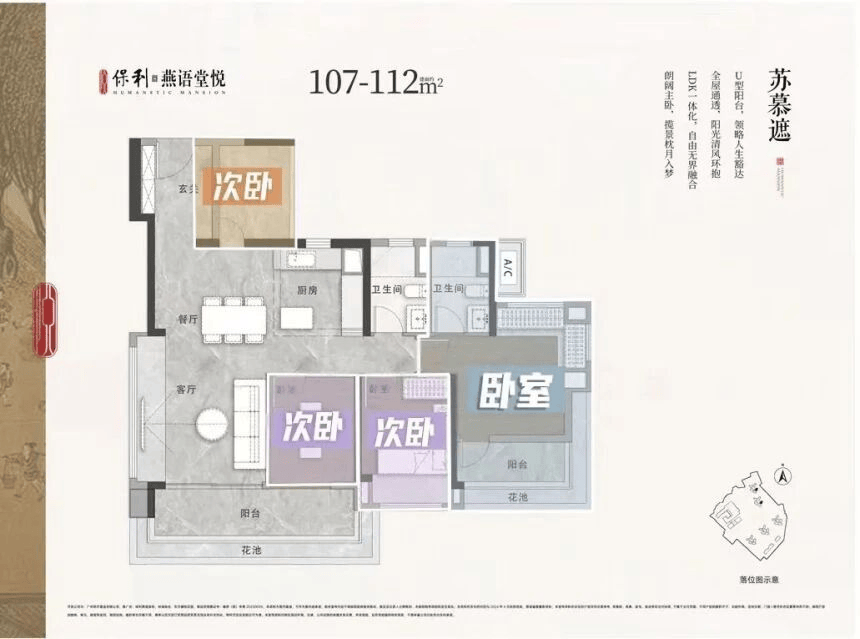 接下来是一百零七平方米的四房户型,总价七百万元起。这个户型专为二孩家庭或多代同堂家庭设计。四开间朝南的布局,保证了每个房间都有充足的阳光。U型厨房的设计,操作面长达六米,洗、切、炒动线流畅,让烹饪成为一种享受。卫生间采用了干湿分离的设计,提升了使用的便利性和卫生程度。四个房间的分布合理,既保证了家庭成员的独立性,又兼顾了互动的便利性。无论是老人房、儿童房还是书房,都能在这个空间中找到合适的位置,满足家庭多样化的生活需求。