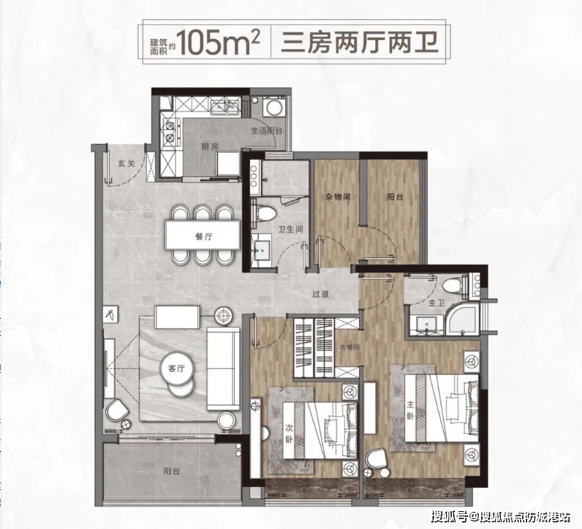 对于首次置业的年轻家庭或三口之家来说,105㎡的三房户型是当之无愧的主力军。该户型提供了A2、A2两种微调选择,以适应不同的偏好。设计上,它采用了经典的南北对流格局,确保室内空气时刻流通,保持清新。厨房和卫生间均采用全明设计,无暗角,有效避免了潮湿和异味。客厅与主卧朝南,采光充足,冬日里满是暖阳。空间布局紧凑而不浪费,每一平方米都发挥了最大效用。两个卫生间的配置,解决了早高峰抢厕所的尴尬,提升了生活的便利性。总价约231万的门槛,让在广州安家变得不再遥不可及,是性价比极高的上车之选。